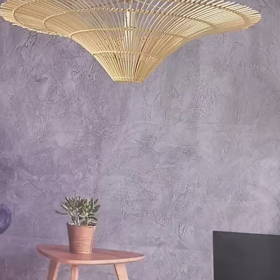 The chandelier is crafted from natural rattan and supported by a minimalist metal frame. Each piece is hand-woven, making every item unique with subtle natural variations.