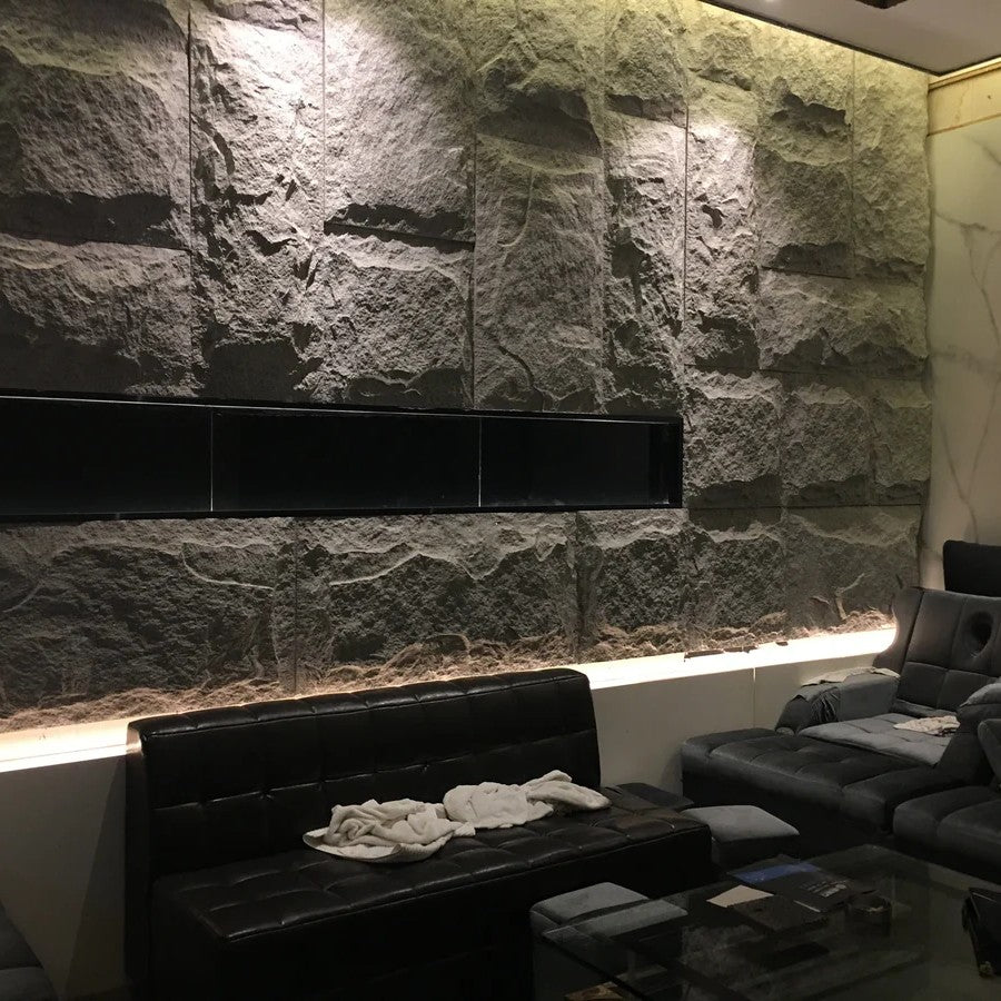 The panel is crafted from high-density polyurethane, designed to closely mimic the texture and look of natural stone while remaining lightweight and durable.