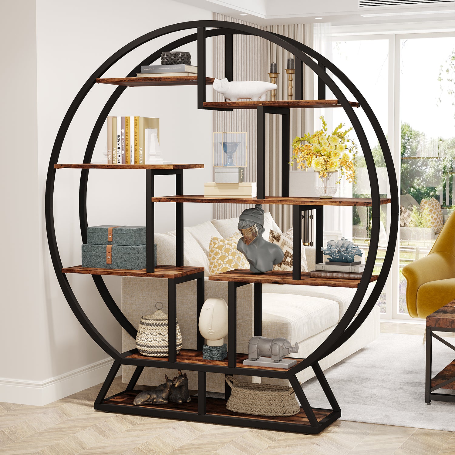 This bold round bookcase isn’t just storage—it’s a statement piece for books, plants, and art that instantly elevates your space.
