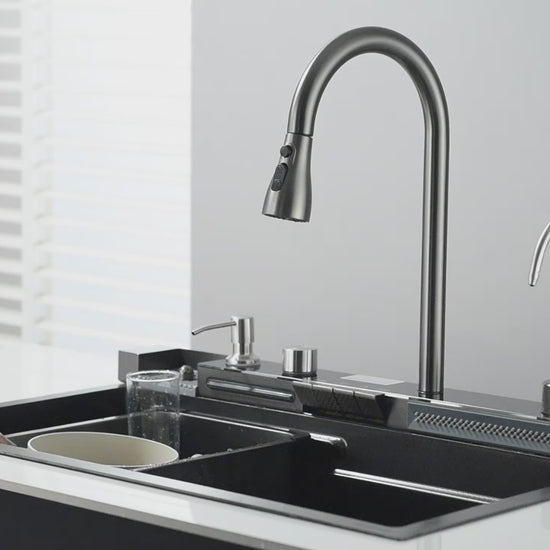 Transform your kitchen with the PureFlow Luxe Kitchen Sink & Digital Faucet, the ultimate fusion of modern technology and sleek design. Crafted from premium 304 stainless steel, this large single-slot waterfall sink offers a stunning aesthetic and outstanding durability.