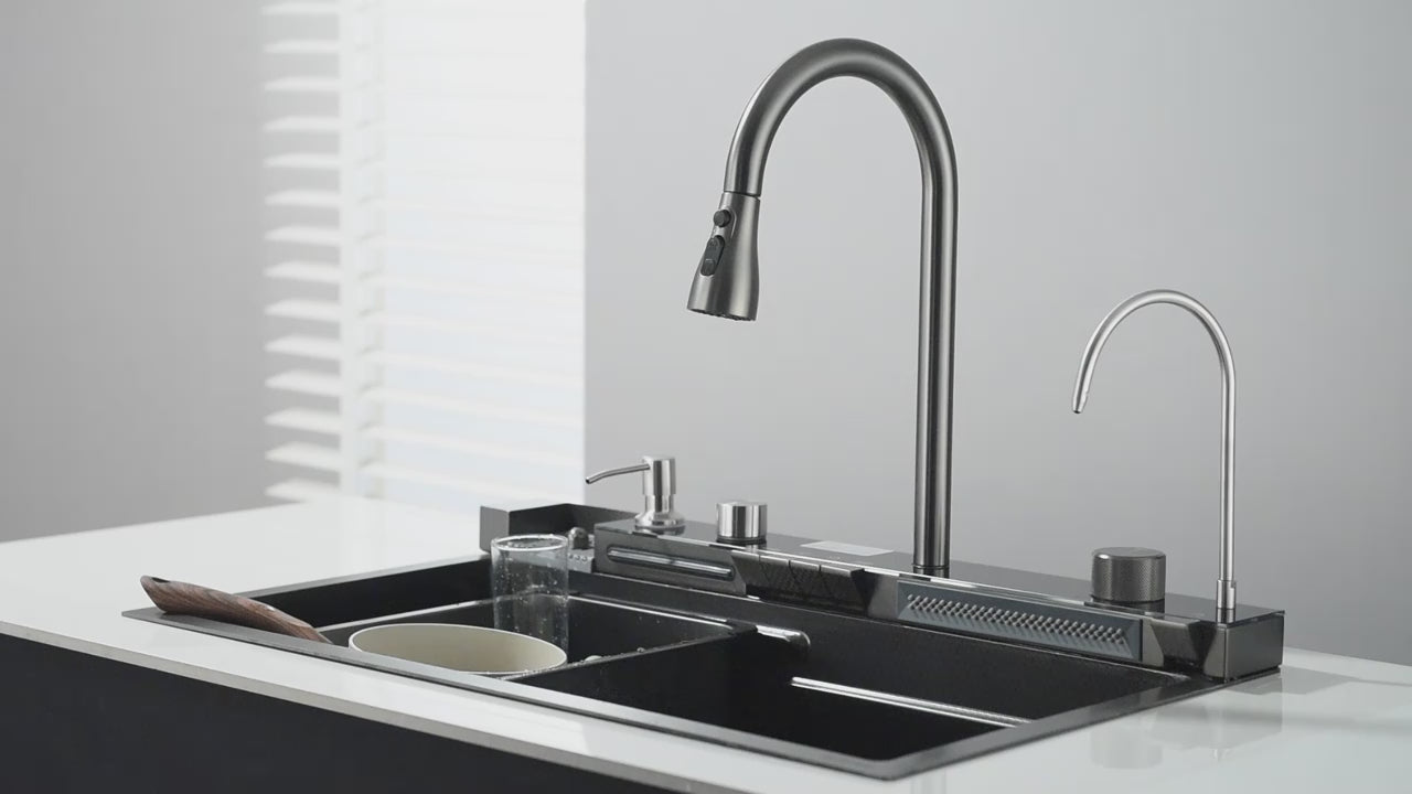 Waterfall Design: Enjoy a smooth and luxurious waterfall flow with the integrated faucet, perfect for creating a calming atmosphere in your kitchen.