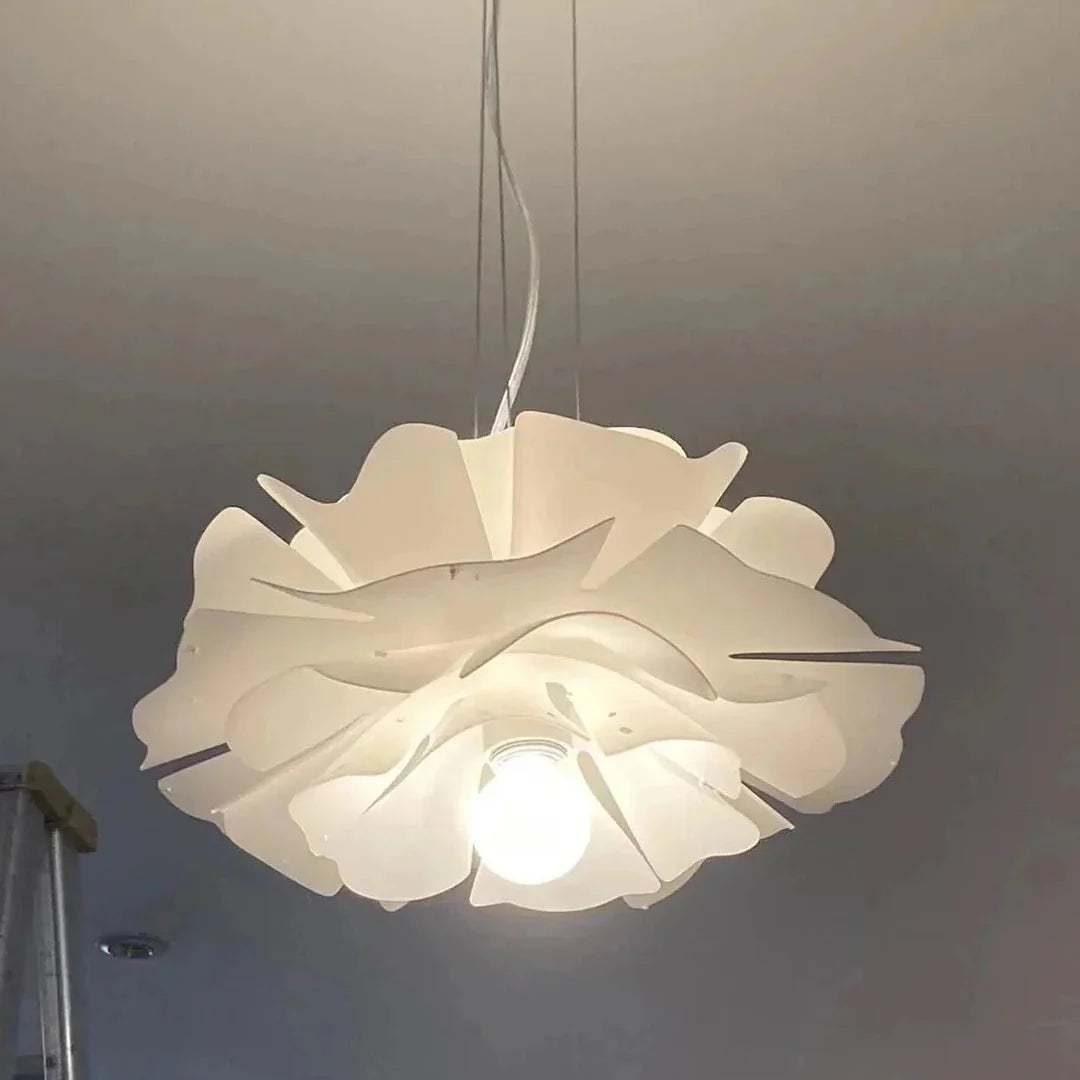The chandelier is crafted from durable acrylic petals and a sturdy iron base, offering a sculptural look with long-lasting quality.