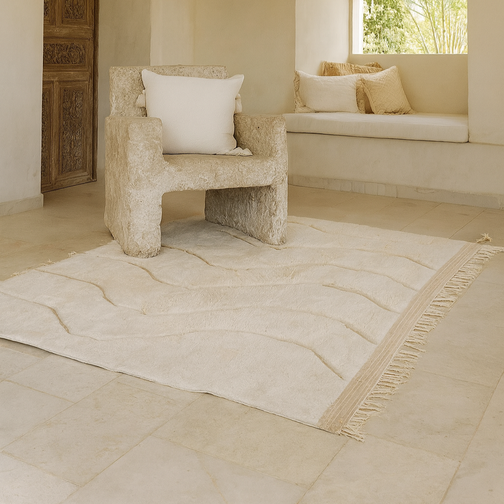 Handwoven in India, this rug features gentle wavy patterns on a soft, creamy backdrop, combining plush comfort with timeless craftsmanship.